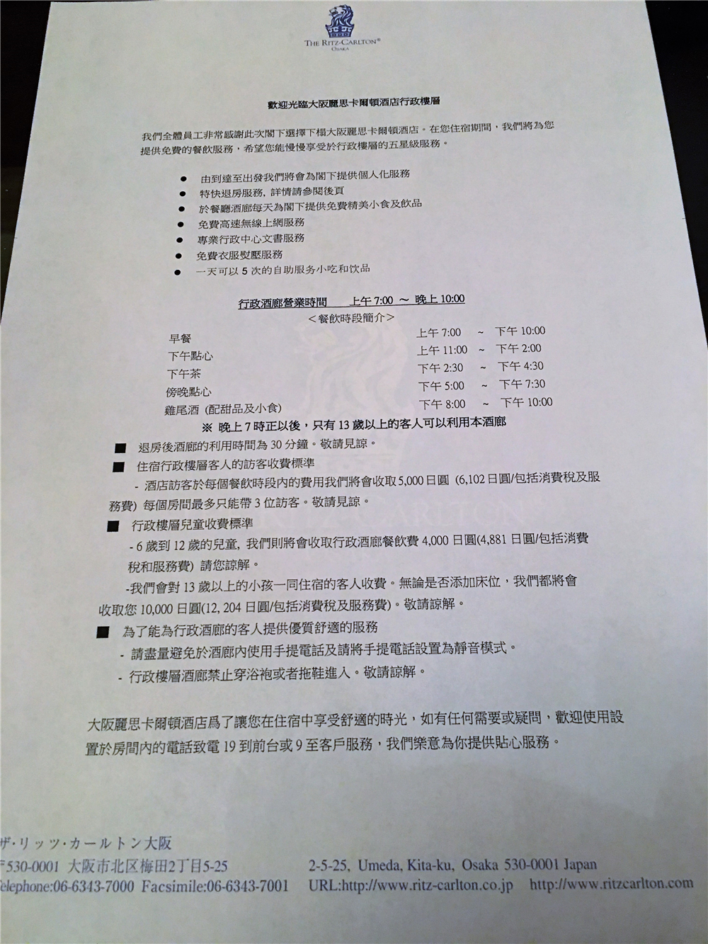 大阪丽思卡尔顿饭店(The Ritz-Carlton, Osaka)-行政酒廊供餐说明