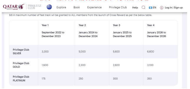 自交叉奖励推出之日起,贵宾俱乐部会员最多可获得下表所示的快速通道名额(名额更新期2025 年起从 9 月改到 1 月重新计算):
