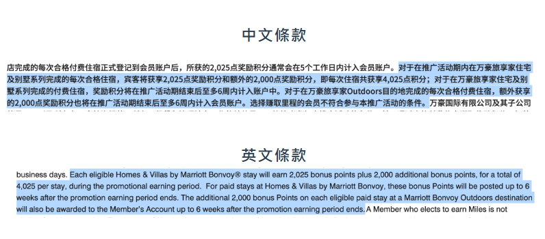对于在推广活动期内在万豪旅享家住宅及别墅系列完成的每次合格住宿,宾客将获享2,025点奖励积分和额外的2,000点奖励积分,即每次住宿共获享4,025点积分;对于在万豪旅享家住宅及别墅系列完成的付费住宿,奖励积分将在推广活动期结束后至多6周内计入账户中。