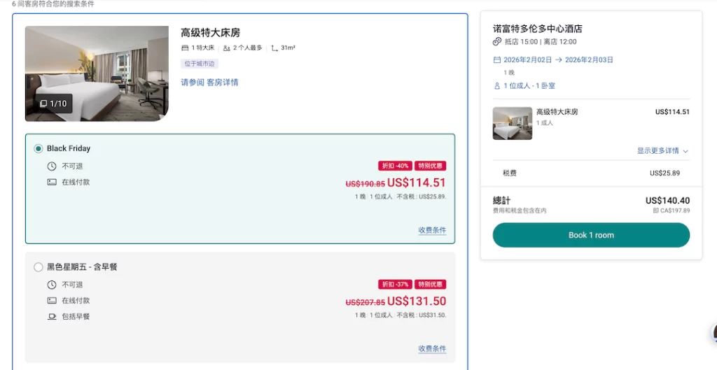 雅高会员在活动时间内预订入住参与活动的酒店即可享受优惠折扣,折扣有效的酒店和适用期间将用红色的“Special Offer/特别优惠”标签突出显示,价格标记为“Black Friday/黑色星期五”(如下图,可能有不适用时间)。