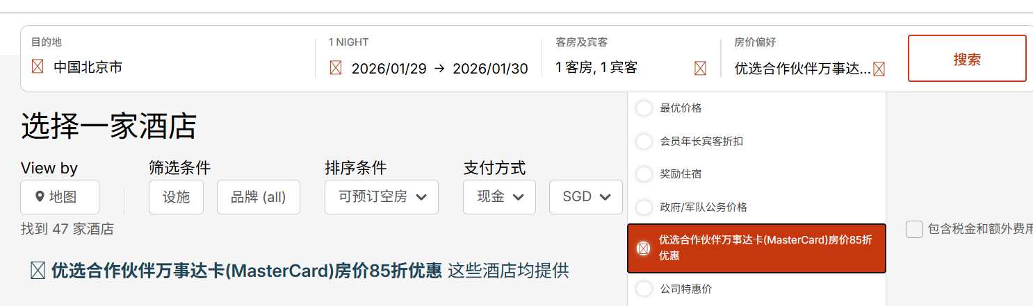 在搜寻酒店时,记得进入【房价偏好】,选择【首选合作伙伴-万事达卡(Mastercard)85折优惠】,设定完成后重新搜寻,优惠价就会出现啦~