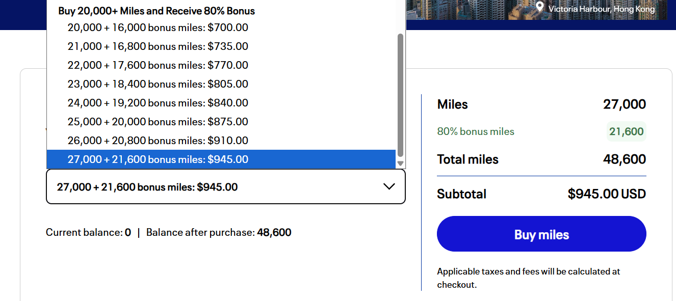 每个会员账户获得的奖励优惠可能有所不同,这次里程家小编群最高收到的只有 80% 加赠奖励积分,购买 48,600 里程(90 天内最多 50,000 里),需支付 945 美元,换算每 1,000 里约 19.4 美元。