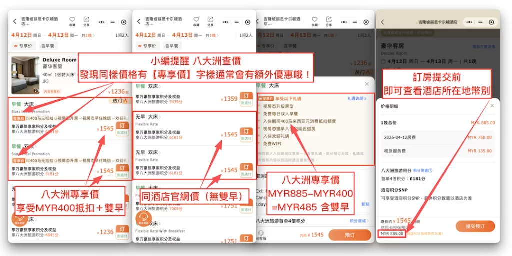 登录上方八大洲专属小程序链接,就能看到「一般平台看不到的会员价与套餐房型」。有时候同一家酒店官网需要 6,000 ,八大洲住三付二之后均价才 4,000 出头,真的差很多。