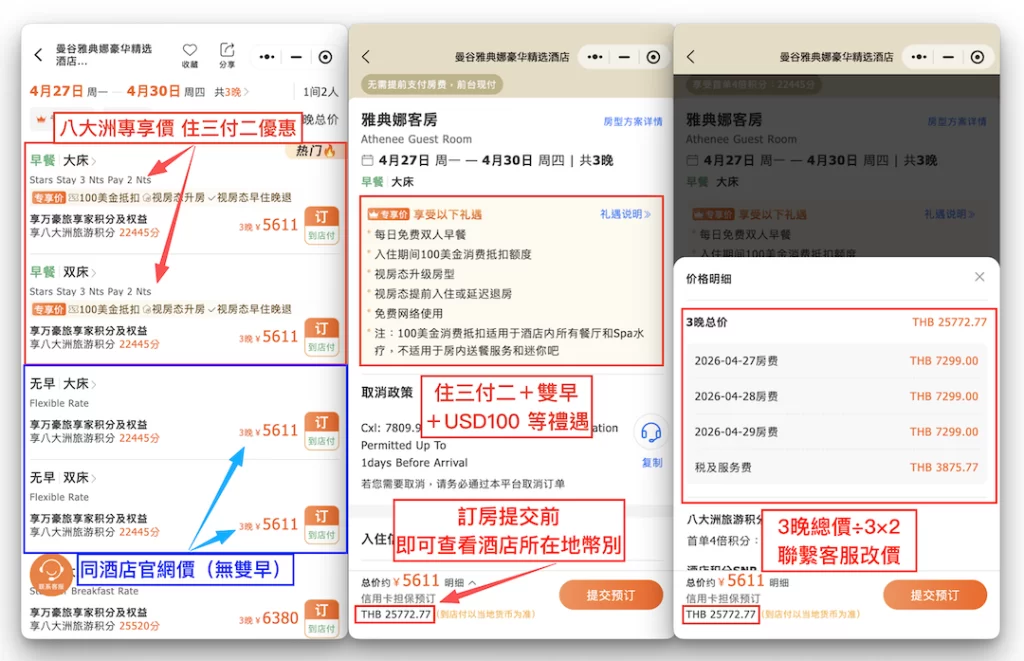 换算方式 👉 3 晚总价÷3 X 2 折合下来平均每晚约 67 折,以曼谷Marquis等级酒店来说,几乎等于以商务酒店的价格却住到旗舰万豪!
