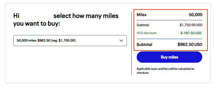 每个会员账户获得的奖励优惠可能略有不同,里程家小编这次获得 45% 优惠折扣,其他会员有可能获得加赠奖励。按最多购买 50,000 里程(90 天内最多 50,000 里),需支付 962.5 美元,换算每 1,000 里约 19.31 美元,比上次加赠 80% 奖励的成本低一点。