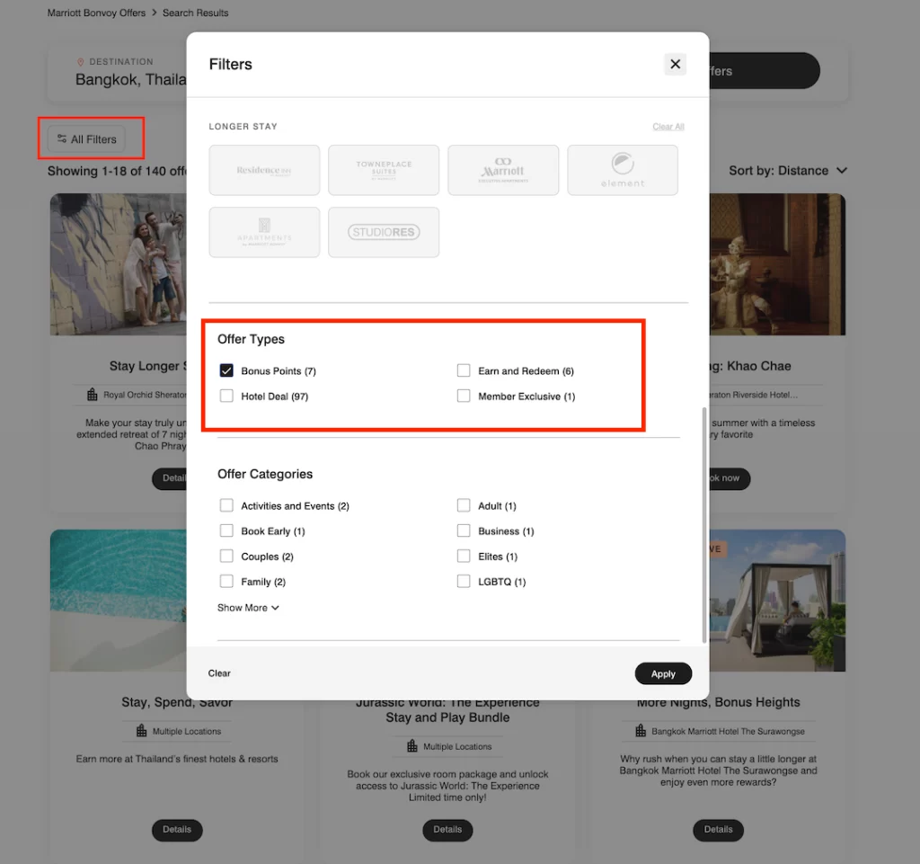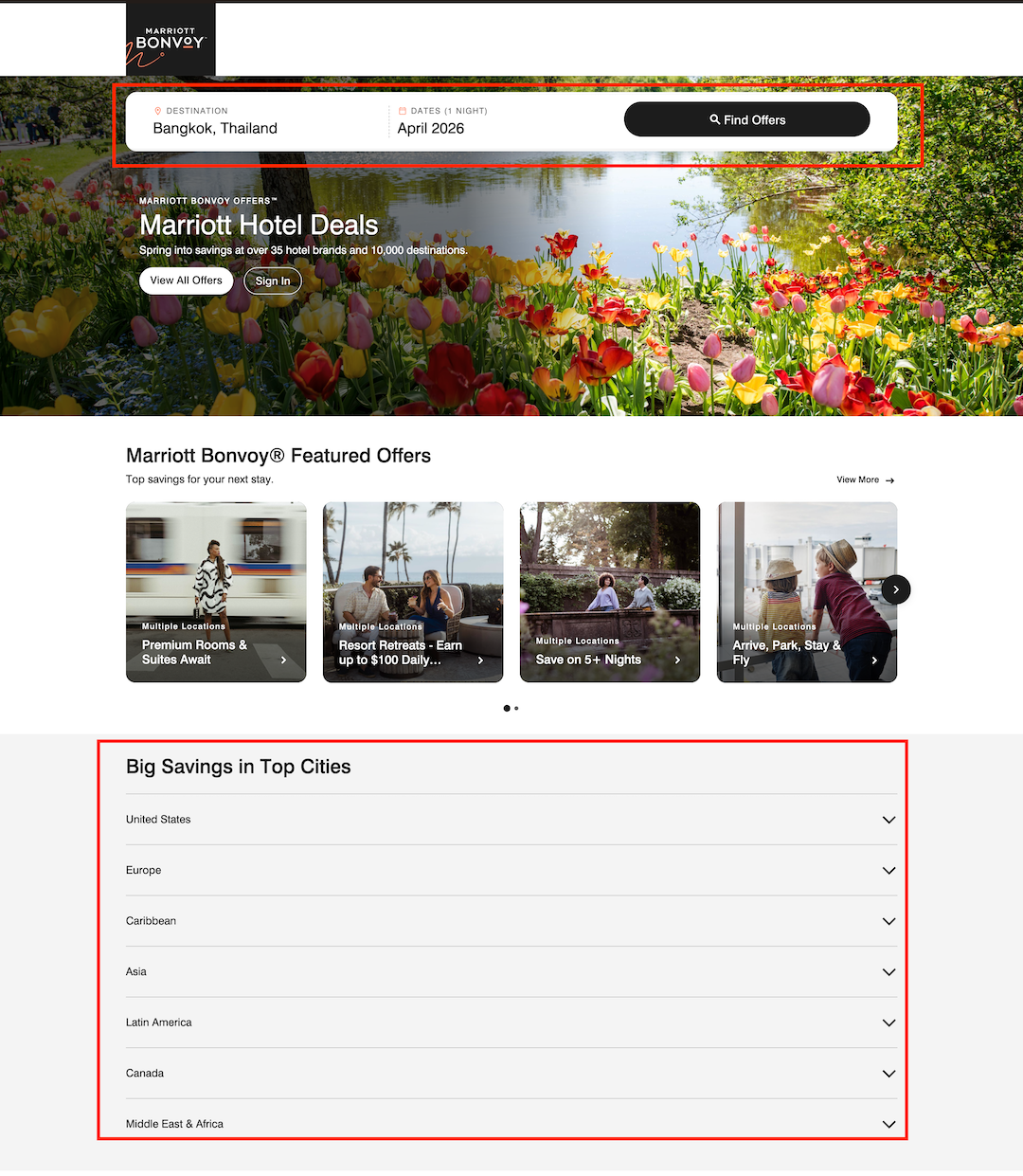 在页面顶部 【Destination/目的地】输入想去的城市 / 酒店名 选好出行时间(可以填具体日期,也可选弹性时间段),点击Find Offers/查询优惠 系统即自动筛选出: – 该地区目前所有可用的 Offer – 符合你入住时间的优惠方案