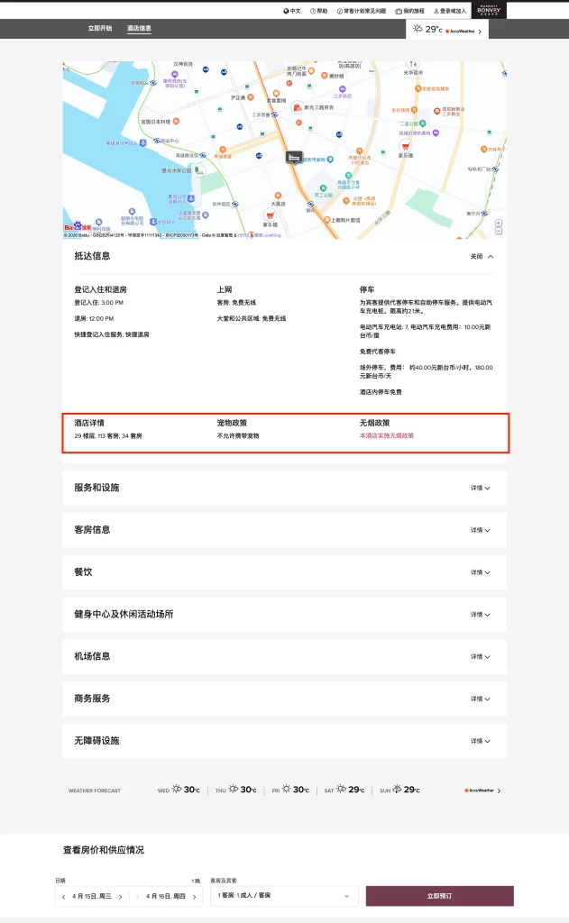 这个页面相当于万豪酒店百科全书,订房前的必看信息全有: